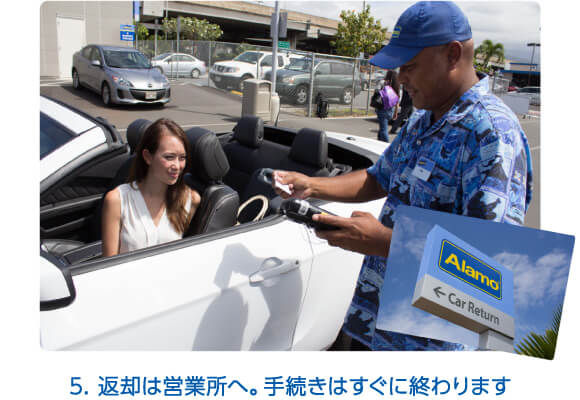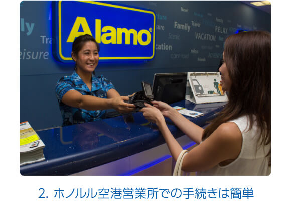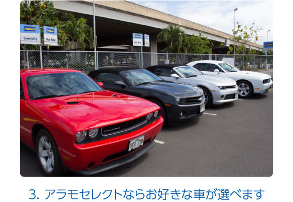 ハワイに来てせっかくドライブを楽しむのだから、レンタルする車のモデルや色、内装、装備などにもこだわりたい。アラモレンタカーはそんなご要望もばっちりサポートしてくれます。「アラモ・セレクト」のサービスで、契約した車のタイプの中から好きな車を自ら駐車場で選べます。車選びに迷った場合は、駐車場で待機しているフレンドリーなスタッフがハワイでドライブの友になる一台を選ぶお手伝いをしてくれます。
