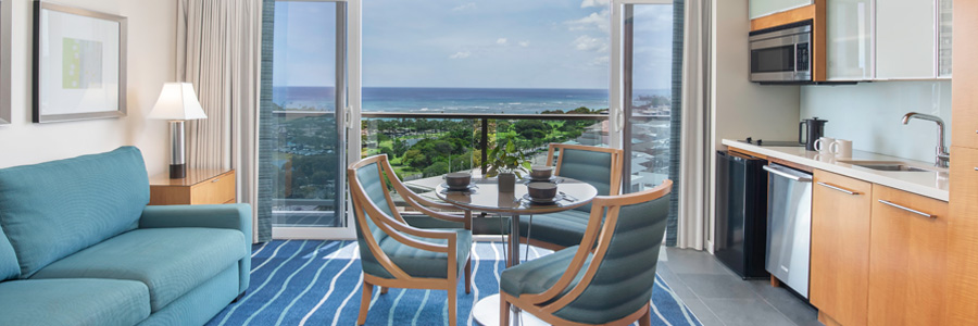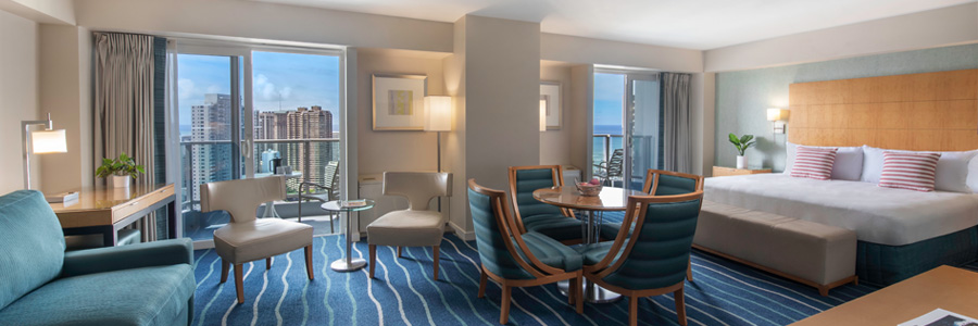 アラモアナ・ホテルには1,000部屋以上のゲストルームが用意され、シンプルなタイプから、キッチン付きの1ベッドルームと豪華なスイート・ルームがあります。いずれも無料で高速インターネットが利用でき、電子レンジやコーヒーメーカーも完備。アラモアナ・ビーチ・パークの海や、緑の山々、ハワイの街並みなどを窓から望みながら、エレガントにデザインされた空間で快適に滞在ができます。