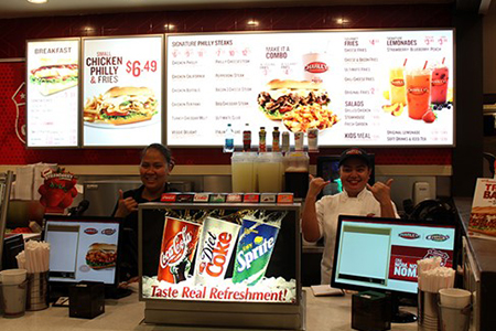 注文するとシェフが鉄板で目の前で調理し、新鮮で出来立ての美味しいサンドイッチを味わえます。米農務省(USDA)認証のステーキ、タマネギやピーマンなどの野菜を鉄板で焼いたものとトマトやレタスなどの生野菜を柔らかめのフランスパンのようなバンズに挟み、その上にチーズがたっぷりかかったフィリーステーキサンドは満足度抜群。