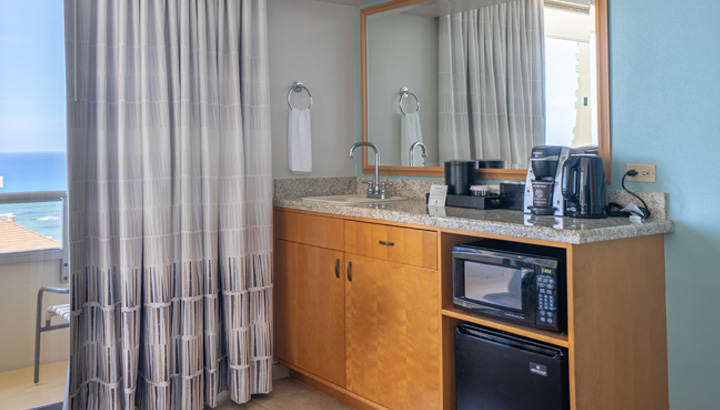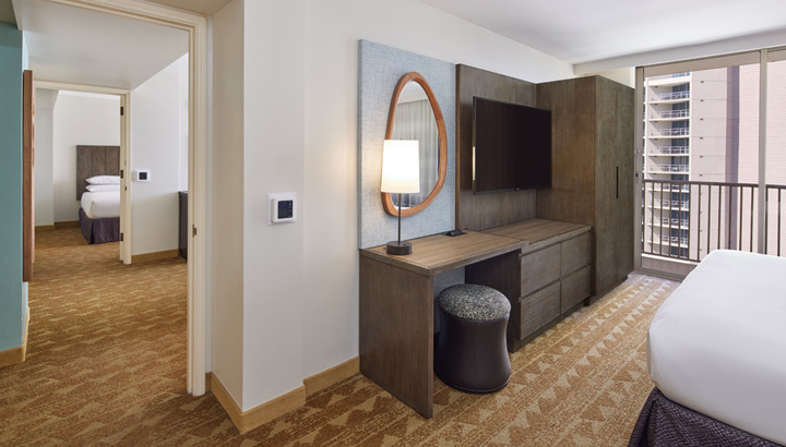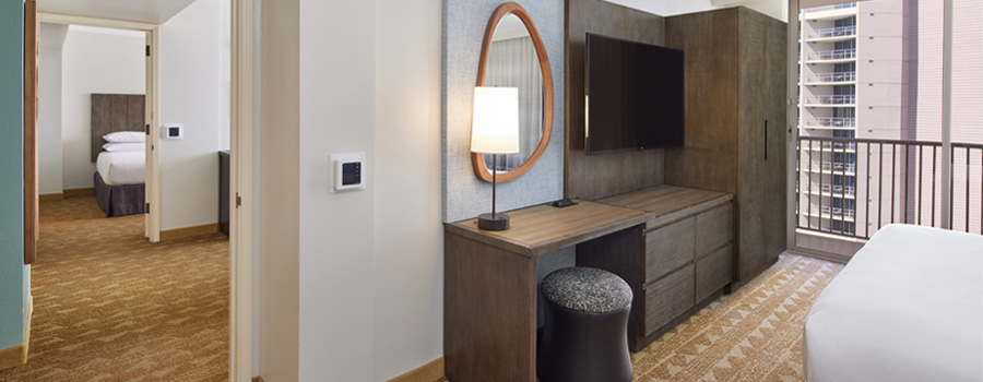 ワイキキの中心という便利なロケーションにあり、ビーチやショッピングへのアクセスがラクラク、全ての宿泊ゲストは美味しい朝食が楽しめて、リーズナブルな宿泊料でお部屋も広い。そんな夢のような条件を満たしてくれるリゾート・ホテルが、「エンバシー・スイーツ・バイ・ヒルトン・ワイキキ・ビーチ・ウォーク」です。エンバシー・スイーツ・バイ・ヒルトン・ワイキキ・ビーチ・ウォークは、ワイキキで唯一、全室スイート・ルームのホテルです。寝室と居間が独立して配され、電子レンジのあるウェットバーなどのアメニティも充実。広々としたスイート・ルームに、通常のホテルルームと同等の、またはそれ以下のお値段で宿泊できるという画期的なコンセプトが注目を集めています。エンバシー・スイーツ・バイ・ヒルトン・ワイキキ・ビーチ・ウォークで最高のバケーションを経験してみませんか?