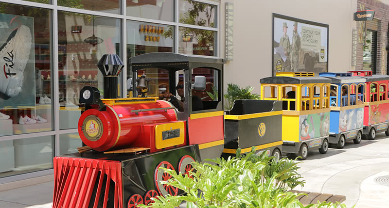 センターコート側にあるステーションから出発するトレインに乗ってモールを周ろう! チケット購入は運転手までどうぞ。
