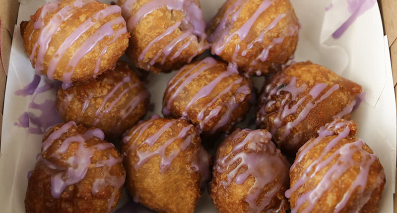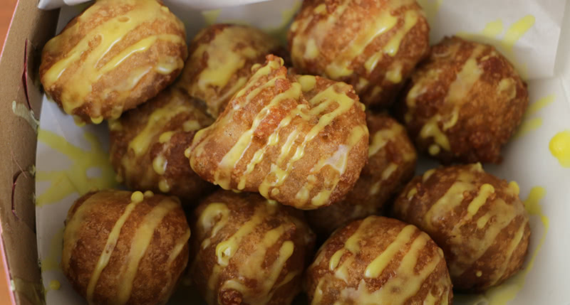 外はサクサクで中はモチモチの食感がたまらないポイモチ。フレーバーは、オリジナル、グアバ、リリコイココナッツ、パイナップル、マンゴーの6種類。