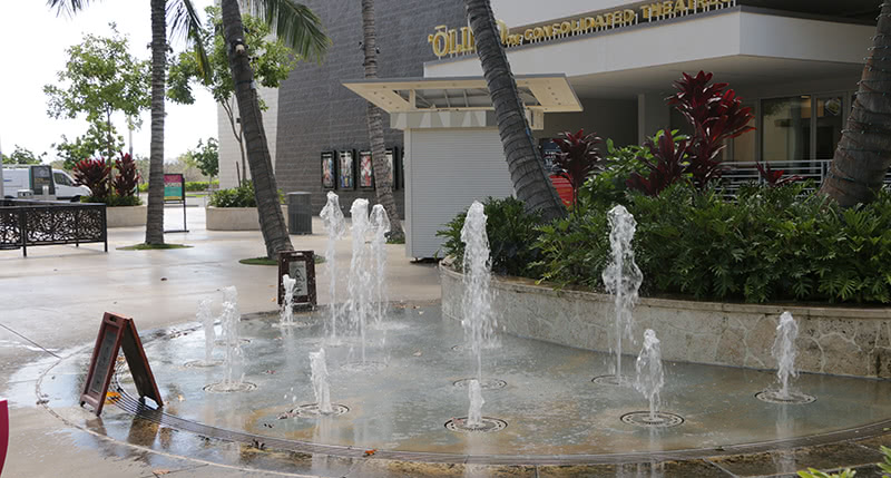 暑い日は水遊びはいかが? モール内の噴水があるウォーターエリアで子どもは水遊びを楽しめます。着替え持参をお忘れなく!