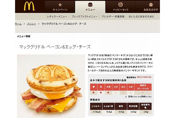 日本マクドナルドは、「朝マック」の愛称で人気の「マックグリドル ベーコン&エッグ・チーズ」を、日本全国のマクドナルド店舗で5月7日(火)より期間限定で、全営業時間帯に販売することになりました。 「マックグリドル ベーコン&エッグ・チーズ」は全部で3種類ある「マックグリドル」のひとつで、メイプル風シロップ入りのパンケーキをベースに、ベーコンやタマゴ、クリーミーなチーズを挟んだ朝マックのパンケーキサンド。通常は朝10時30分までの朝の時間帯限定のメニューでしたが、2007年の販売開始から好評で、今回の期間限定企画を発表しました。 朝から手軽にパンケーキを楽しめるのも、マクドナルドならではですね。 (International Business Timesより) |
