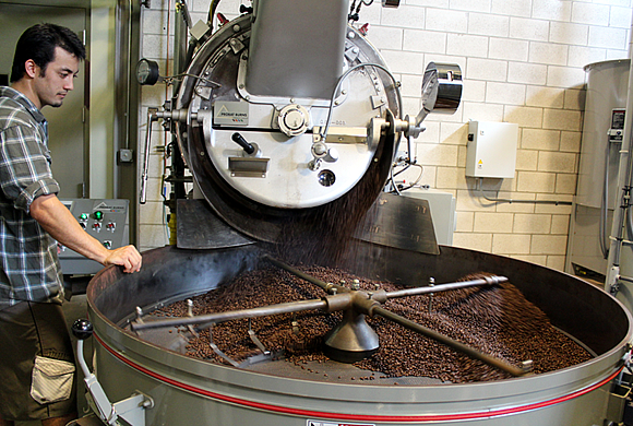 これを特製の焙煎マシーンで焙煎するのです。焙煎マシーンは、ドイツProbat社のG60というタイプ(写真下)。タッチパネルで操作する最先端の機械ですが、やぱりコーヒーを最高の状態に焙煎するには熟練した人の手が必要で、香りと色、そして焙煎時の音を聞きながら仕上げていくそうです。