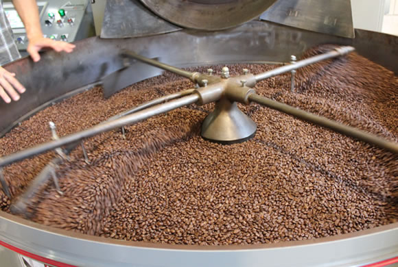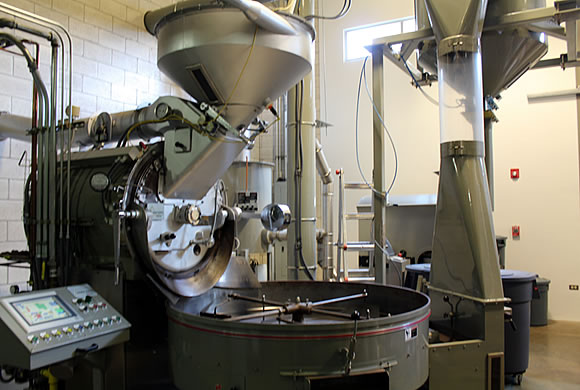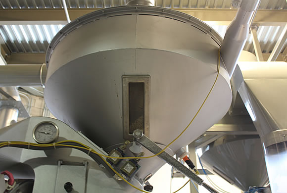 このマシーンはとても大型なので、人力で豆を投入することができません。なので、取り込み口に入れた豆を吸い上げ直接マシーンに運び入れます。部屋の天井近くには太いパイプが縦横に通っていますが、この中を豆が移動しているわけなのですね。取り込み口から吸い上げられた豆は、マシーン上部の漏斗状の部分に溜められたあと焙煎されるという仕組みです。