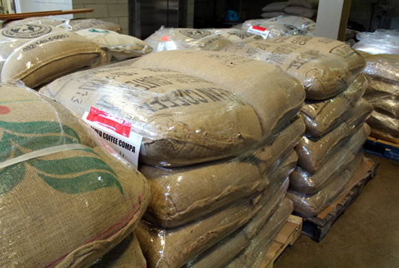 建物内に入ると、コーヒー豆がたくさん詰まった袋が目に付きます。この中に入っているコーヒー豆はまだ茶色ではありません。平べったい形の白っぽいグリーンの豆で、香りも木の実のような薄い香りです。ちなみにコナコーヒー・パーベイヤーズは「シングル・エステート」ということにこだわり、すべて単一の農家産の豆を使っているそうです。