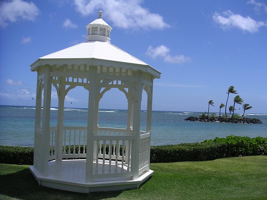 プルメリア・ビーチハウスの目の前にあるビーチでは、ウエディングも出来ちゃいます。う~ん、こんな場所でハワイ挙式が出来たら素敵だなあ。純白のガゼボと青い海をバックに純白のドレスに身をまとった花嫁。そして、トロピカルな花のむせかえるような甘い匂いに包まれて参列者は、ハワイアン・ミュージックを堪能するのです… ダンスなんかも優雅に踊ります…