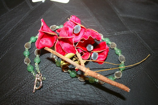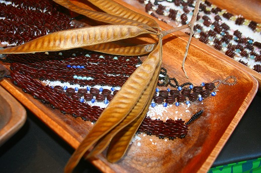 マウイ・ベルベットと呼ばれる植物の種とジェード(ヒスイ)のコンビネーションのネックレスです。赤いものは、これはその植物のサンプルです。信じられないような真っ赤な色ですが、人工のものではなくて、天然のものですよ。この種、本当にベルベットみたいというか、子猫の毛みたいというか、ツルツルフサフサなんです…