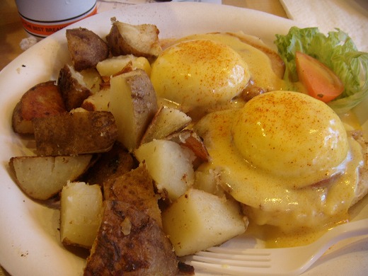 長年かけてやっと見つけた理想のエッグス・ベネディクト。それは、ハワイ地元のパンケーキ・チェーン、「コア・パンケーキ・ハウス」のものなのです。アイエアやカポレイ、カネオヘなど各地にお店がありますが、私は近所のモアナルア・ショッピングセンター店に行くことが多いですね。セルフサービスで、結構庶民的なこのお店。お皿も紙皿だし、フォークはプラスチックだし、およそ夢はありません。
