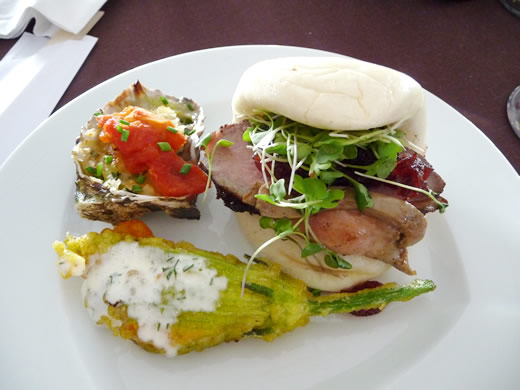 色々な雑誌に紹介されたりしてるみたいだけど、日本ではなかなか手に入らないらしいからハワイに来たらゼヒ試してみてね! 左上は「ベイクド・オイスター」、右上は「北京ダックとフォアグラのバン」、 酔いがまわってきて、忘れちゃった!