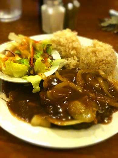 ふふふ、このB級感だたようハンバーグ、美味しそうでしょ。 たまに予想外に美味しいものに出会うことがあるけど、このハンバーグもそう。 ちなみにサイミンとは、ラーメン風味のややあっさり系の麺料理のことで、ロコが愛してやまないハワイ独自のものなのです。 ところで、「何故サイミン専門店なのにハンバーグ?」ってことなんですけど、 大きめのタマネギの炒め物とグレービーがとろ~りとかかったハンバーグ。パクリと一口食べたら…? サイミンがメジャーなお店ですけど、ハンバーグもすごく美味しいですよ! おすすめ。 ちなみにお値段は$7.85と控えめ。サラダも付いてまーす。 田中サイミン |