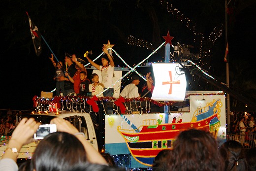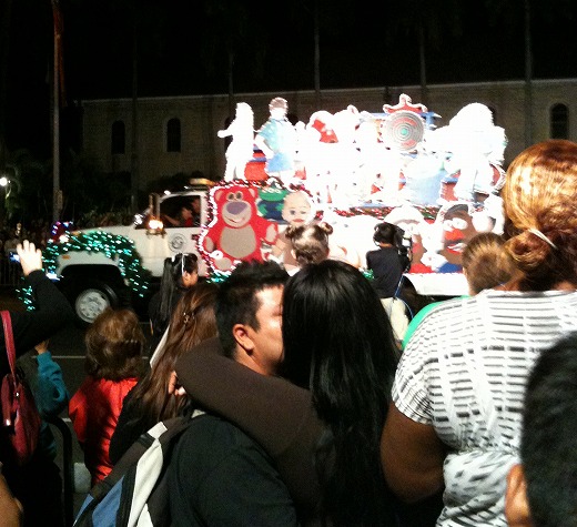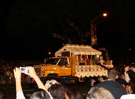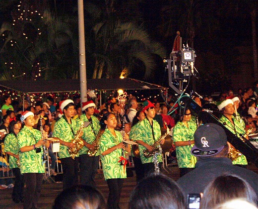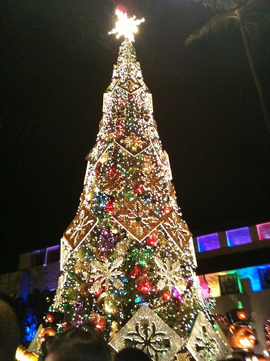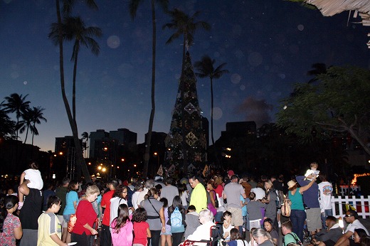 毎年12月初頭から、お正月まで、ホノルルのダウンタウンは、たくさんのクリスマス・イルミネーションで飾られます。イルミネーション見学ツアーなんてのもあったりして、毎年たくさんの人々で賑わうんですよー。「ホノルル・シティ・ライツ」という曲もあったりして。聴いたことある方も多いかもしれませんね。 12月の最初の土曜日に行われるのが、ホノルル・シティ・ライツの点灯式。なんと、7万人以上もの人が訪れると言うのだから、すごいですよね。今年も、ホノルル・ハレ(市庁舎)前広場を埋め尽くす、人、人、人…