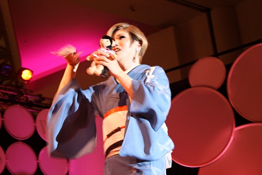 透け感のあるブルーの着物がハワイにピッタリ合っていましたね。それにしても、着物での立ち居振る舞いも素敵でした♪ 途中でハッスルしすぎたのと、舞妓さんが履くようなかなり高さがある履物で踊っていたせいか、ステージ上の段差のところでコケてしまう一面もありましたが、それもご愛嬌。この方は何をやっても魅力がありますね。