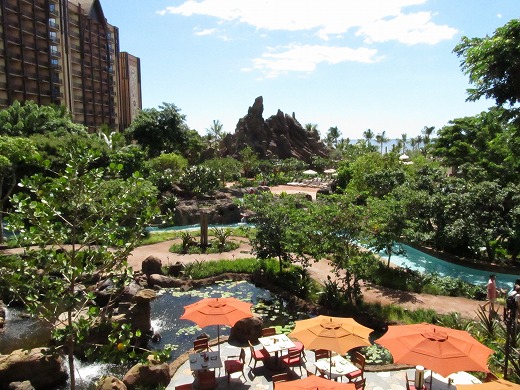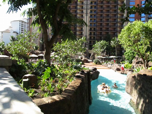 ロビーを抜けると庭園が! わっ、流れるプールがありますね。ウォーター・スライダーもあるみたい。 残念ながらプールに入れるのは宿泊している人だけなんですけど、お庭を散策してみましょう。