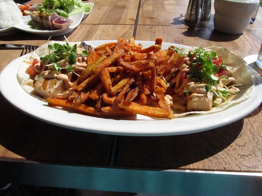 フィッシュタコス。お魚は日替わりです。今日のお魚はモンチョン。中央はスイートポテトのフライです。 すごく、美味しい~っ!