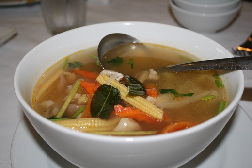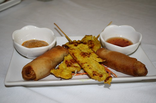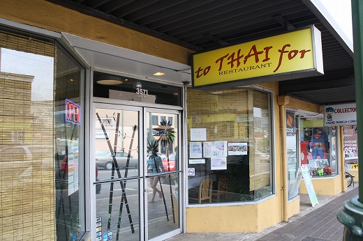 今日のランチブログ、あのジェイク・シマブクロさんおすすめの、カイムキのタイ料理屋さんに行ってきました! 通好みのレストランが集まる街、B級グルメタウン、カイムキの真ん中にあります。 ところで、to THAI forってどういう意味だか、わかりますか? 英語で、”to Die for”は「ものすごく(死ぬほど)魅力的な」という意味の俗語表現なのですが、それをもじってあるわけですね。 アメリカ人なら思わずニヤリとしてしまう、秀逸なネーミングですよね。 私たちはランチタイムに出かけたのですが、ランチタイムにはお得なランチスペシャルがあります。 $2.50出してコンボにすると、下のようなスプリングロール(春巻き)とチキン・サテー(鳥の串焼き)が2本ずつ付いてきますよ。 ピーナッツ・ソースや甘酢風味のソースでいただきます♪ タイ料理といえば、やっぱり何といってもトム・ヤム・クン! スープの王様ですね。 ランチセットの場合、チキン、ポーク、ビーフ、豆腐から1品具が選べます。エビはディナーのみ。