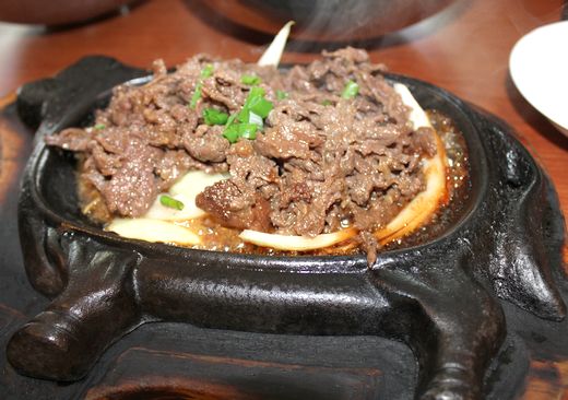 ステーキみたいな鉄のお皿にジュージューいって登場です!