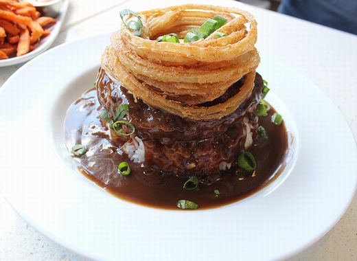 先日撮影で訪れたカハラモールで、食いしん坊に絶対すすめたい、がっつりランチのお店を発見しました。とにかく全部サイズが、でかい、でかい。日本の方に人気というロコモコは、このとおり。見てください!ハンバーグの厚みが、2cmくらいあるんじゃないの?! しかもその上にオニオンリングが「これでもか!」というほどのせてあって、ロコモコになくてはならない目玉焼きが、のっているのにまったく見えません(驚)。