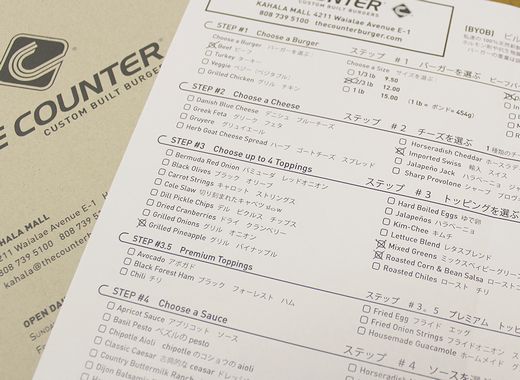 こちらのお店の名前は「ザ・カウンター・カスタム・ビルト・バーガー」。「カスタム」と店名についている通り、オーダーメイドのハンバーガーが作れるのが魅力なんです。写真のように、パテの種類、サイズ、チーズ、トッピング、ソースなど、すべて好みのものをチェックリストに印をつけてオーダーします。メニューもこのとおり日本語表示なので、安心です。