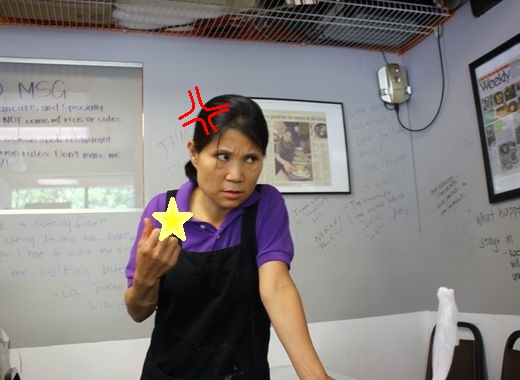 店に入ると、店員さんは誰もいません。勝手に空いている席に座ります。そしてテーブルには、このお店のルールが書かれています。これによると、オーダーは紙に書いて、厨房で調理しているアングリー・コリアン・レディ(略してAKL)に渡さなければいけません。水はセルフサービスで、勝手に厨房の中に入り、左手3番目の扉の冷蔵庫を開け、3番目の棚にある水を持っていくこと。調理中にAKLに話しかけてはいけない。AKLが閉店のサインを出しても調理してほしかったら、食べた後の皿は自分で洗うこと。質問があってもAKLに聞くな、ほかの客に聞くこと!