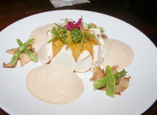 こちらは、かぼちゃとゆずソースつきオノのたたき。泡立ててあるゆずのソースをつけて食べると何とも言えません