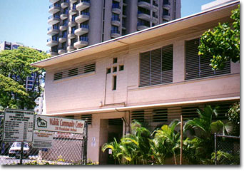 初回だ。緊張するなあ。「フラ体験記」っていったって、、、。フラのこと、フラのこと…。ハラオ(学校)に入って4年たってもまだ初心者みたいなものだから、そうそう学術的なこと、専門的なことは書けません。あしからず。このページでは、私の個人的な体験を通じて、皆さんにハワイのフラ教室の情報や、ダンサーたちのナマの姿などをお届けできたらいいな、と思っています。よろしくお願いします。初めて練習場を訪れたのは95年1月。私の通っているハラオは、そのころはまだ今のように立派な専用スタジオがあるわけではなく、ワイキキコミュニティーセンターの1室を借りていました。本土からホノルルに着いたのが前年の12月。花見の季節には日本に帰国する予定でした(予定は本当に未定です)が、職探しと平衡してフラハラオを探しました。日本のバブルはまだはじけていなかったから、年末に向けて猫の手も借りたい旅行会社に運良く仕事がすぐ見つかったのです。反対に、あなどっていたフラハラオ探しにはてこずりました。ハワイには知り合いが1人もいない身、頼りは電話帳や街角にあるスタンドのフリーインフォメーションのみ。かたっぱしからスタジオらしき場所に電話しましたが、どれも成功しませんでした。地図を見て近所だとわかると、直接訪れてドアの隙間からメモをはさんでおいたりしましたが、連絡をもらえても、「短期間ではちょっと」と断られました。後でわかったことですけど、けっこう多人数のダンサーをかかえるハラオでも、専用スタジオを所有しているのは稀なケース(維持費がかかるもんね)で、ほとんどがパブリックのコミュニティーセンターや学校の施設を借りたり、またはクムフラ(先生)の自宅を開放して練習場に充てているらしいんです。それに、大人のクラスの練習時間帯は週末を除いて夜が多い…。だから、昼間練習場に電話しても連絡がとれないのは無理のないことだったんです。