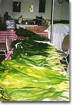 6.ディボーン:ティーリーフの下準備として、葉の芯を抜く作業をします(詳しくは「ティーリーフスカートの作り方」の回をお読み下さい)。包みやすいようにできるだけ葉の先に近い部分から芯を抜きます。大きなバケツに水を張り、数枚ずつザブザブと洗った後、大小のサイズに分けておきます(写真右)。具の種類により大きさが異なるからです。(つづく)