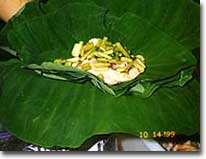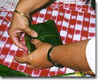 9-1. ラッピング(ポーク):ハラオでは肉の種類により3種類の形で包みます。識別しやすいためもありますが、「プレゼンテーションも重要な商品価値」という概念から分けられました。ポークは1番オーソドックスなラウラウの形です。ティリーフの葉の先の方から具を包みながら巻き、茎を残したままでもう1枚のティリーフを交差させて同じように巻きます。茶巾にして、まず紐で結び、外側のティリーフの茎を縦に2つに割き、紐の上で結びます。最後に余分の茎を切ってでき上がりです。中の具が外から見えないように包まなくてはいけないのですが、ティリーフが小さかったり細かったりすると2枚では足りない場合があります。