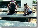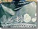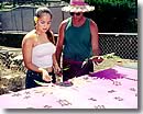 デザインが決まったら、布の色選びです。作業室の棚には、ブティックのショーケースさながら色とりどりのパレオがたたまれています。一言に赤色といっても、深紅からサーモンピンクやショッピングピンク、オレンジに近い色まで、微妙に色合いが異なるので、どれを取っても同じ色のパレオを見つけることはできません。染料を混ぜて好みの色を作ります。手染め特有の微妙な色を楽しむことができます。私は、2番目に好きなグレーに決めました。実は1番好きな色の黒で作りたかったのですが、ここで使う染料は化学薬品ではなくすべて植物からの自然な抽出物で作られているので真っ黒という色はできないのだそうです。たたんで水に浸しておいた布に染料を染み込ませて、しわがよらないように注意しながら作業台の上に広げます。