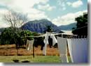 パレオを作りに行きました。初めてのことで、何を着て何を持っていけばよいのか、さっぱり見当がつかなかったので、汚れてもよい服 、Tシャツとショートパンツにスニーカーという作業風服装で出かけました。クリスマスツリーの配布の時は、Tシャツを松やにだらけにして台無しにしてしまいましたし、ラウラウ作りの時はルアウの灰汁で緑色に染めてしまったので、今回は染料で染まっても気にしない格好にしました。朝、フラシスターの家に集合し、6人が2台に便乗して出発しました。週末なのでフリーウェイは空いていましたが、時速95キロを維持しても島の西の端に位置するワイアナエまで1時間近くかかりました。州政府が開発を急いでいるカポレイあたりを過ぎると、のどかな郊外の風景が広がります。連休の中日だったので、海辺にはキャンプのテントやバーベキューセットが並んで、ゲームや海水浴を楽しんでいる人たちで賑わっていました。