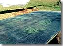 きれいに染め上げる必要条件は温度ではなく光なのだそうです。この日の太陽の光は最高、とのことでした。布の上に型を置いて行く時、数秒してから位置をずらそうと思ったら「時すでに遅し」で間に合いませんでした。「黒に近い色はすぐ染まる」という注意を実感しました。失敗のないように自分のデザインを頭に描いてから型を迅速に置いていくことが必要です。網をかぶせて台に固定させた後は太陽にお任せします。