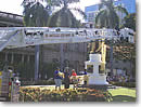パレードの前日には、レイセレモニーが開催されました。アリイオラニハレにあるカメハメハ王の銅像が、たくさんのレイで飾られました。多くのボランティアの手によって、朝8時から長さ26フィートのプルメリア・レイが作られました。レイをかけるにはクレーン車が出動します。色とりどりの花のレイ がかけられた後、マイレなど葉のレイもかけられて、銅像は文字通りレイに埋まります。集まった観客達は、想像するだに芳しい香に包まれることでしょう。 |