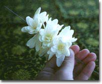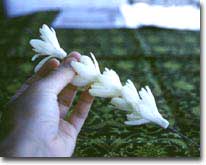 今回は、通称チューブローズと呼ばれる、クパロケ(またはクパロ)のレイを作ります。アマリリス科に属するこの花は、4・ほどの白い花を咲かせます。一番の魅力は、すっきりとした甘い香り。このレイをつけていると、自分のまわりに甘い空気が漂って、幸せな気分になれるのです。インターネットではこの香りがお届けできないのが残念・・・。