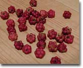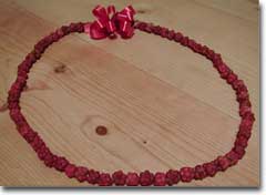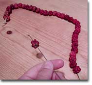 あとは、いつもの通り1mくらいのたこ糸(しっかりした綿糸)か、2本取りのデンタルフロスを使い、12インチ(約30・)のレイニードルにかけます。もう片方の糸端は固結びします。そして実の根本(茎が付いていた部分)の固いところにレイニードルを入れ、糸を通します。ちょっと固いので実を左手で押さえて右手でエイっとさしていきます。7個針にさしたら、ゆっくりと糸端までひっぱります。あとはこの繰り返し。ころころしていてビーズ遊びの感覚です。