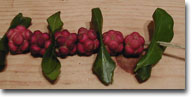 これだけでも結構かわいいのですが、花屋さんではよく、以前ご紹介したティーのレイや、白い小さな花のピカケとからませたりします。グリーン系と合わせれば男性向けのレイ、お花と合わせれば女性向きのレイに早変わりする臨機応変な実です。特にグリーンとの組み合わせはきれい。お花屋さんで見たのは、小さい葉っぱを3枚重ねて半分に折り、中央に糸を通していく方法(写真参)。実2〜3個おきに葉を入れるとバランスがいいようです。男性のお客様がハワイに来たら、試してみようかな・・・。