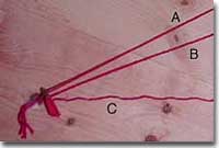 2. 写真1のように短い2本のAとBも、結び目から少し離れたところで、テーブルにテープで貼り付けます。一番長いCは、この時点では一番下にくるようにしておきます。