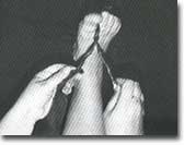 そう、一見つまらない本に見えるんです。しかし、よ〜く見てみると実際に作る時に役立つ説明やコツがたくさん書かれていて以外にもすぐれもの。しかも・・・見よ!この「足使い作戦」を!!ティの葉のレイを作る時は確かに、片方の端を固定しなければならないので、ビショップ博物館で習った時には専用の道具があったし(5回参照)、前出の本ではもう一人の人に持ってもらったりしています。しかし、この本は自分の足の指にはさんで一人完結作業を実現しています。まあ、どのやり方でもいいんでしょうが、もしかしたらハワイアンの人は足使うのかもなあ、などと思い、変に感心してしまいました。 |