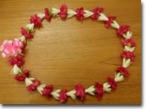 と前置きをしながら、今日はカーネーションだけのレイを作りました。用意したのはピンクの濃淡のカーネーション各20〜25個です。それにいつもの12インチ(約30・)のレイ・ニードル(針)。2・60・の糸(木綿糸かデンタル・フロスでも)を半分のところで折り返して2重にし、糸の端を10・くらい残して固結びにします。針のカギの部分に糸をかけたら作業開始。カーネーションの花はガクの根もとの部分で切って茎を落とします。そして花の下から上に向かって、花の中央を通るようにニードルをさします。色の違う花を交互に4個くらいさしたら、静かに糸の端の結び目までしずかにひっぱります。この時花と花の間はちょっと押し気味に詰めて、ガクがなるべく見えないようにします。こうやってどんどん濃淡のカーネーションを重ねていき、ちょうどいい長さ(1・くらい)になったら、糸の端同士を結び輪にしてできあがりです。