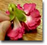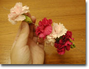 この作り方の他に、カーネーションのガクの部分を4つに裂いて、花を広げる方法があります。こうすると花は平べったい形に広がるため幅の広い華やかなレイになります。ちょっとトライしてみましたが花がうまく開かずちょっと失敗(写真右)。上手にできれば豪華なんだけどなあ・・・・。