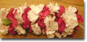 カーネーションだけのレイも素敵ですが、他の花と組み合わせたレイもきれいです。右上の写真はチューブローズとカーネーションのコンビネーション。カーネーション自体はあまり香りのない花なので、チューブローズのような香りの良い花を使えば、色も香りも楽しめるレイになります。