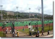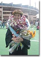 なんとかローズのレイをゲットしたものの約束の時間にかなり遅れ、ハワイ大学へダッッシュ。式はすでに終わっており、道すがらたくさんのレイをかけた卒業生らしき人たちとすれ違いました。門を通って、校舎をよこぎり視界が開けると・・・