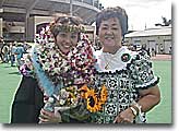 「T」のエリアに行くとすでに人が帰り始める気配が・・。まずい、と必死に探していると案の定帰りかけたエリースをみつけたのでした。彼女は人一倍たくさんのレイをつけて、ほとんどダルマ状態。レイに埋もれて前も見えないくらいです。頭には素敵なハク・レイ(編み込むタイプのレイで頭に飾る)をつけていました。「遅い!」とせめられながらも、無事にレイを渡すことができて、記念撮影も完了(写真は筆者でなくお母様です)。ああ、間に合って良かった!それにしてもこのクソ熱い天気、黒いガウンを着た卒業生にはちょっと酷ですねえ。まあ、ロコたちは平気なのかなあ・・・。
