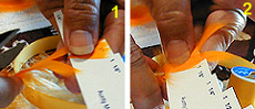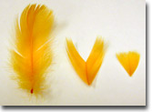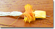 まずは色選び。羽毛はカラフルな様々な色をチョイスできるのですが、私は一番ベーシックだというオアフ島の色・イリマ・カラー(山吹色)を選びました。最初は羽毛のカットから。1本ずつ、羽のトップから1インチ(約2・)のところを、糸切りはさみでカットします(写真1)。そしてVの字になった残りの部分をまた1インチ分カット(写真2)。残った根本の部分は捨てます。