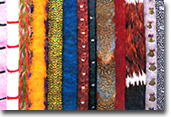 数日でなくなってしまう花のレイに対し、形が後に残るフェザーレイは、ハワイの王室など身分の高い者が身につける、特別なレイだったそうです。色とりどりのトロピカルな鳥たちの羽を使ったレイは、何万もの羽根を手作業で作るその労力の大変さと、鮮やか彩りで珍重されました。しかしながら、現在はそれらのハワイ原産の鳥は保護鳥となっており羽の入手が困難なため、主にアヒルやガチョウの羽を染めたものが使われているそうです。フェザーレイ自体、作る人も非常に少なくなってきたそうで、このお店も採算をとるというよりは、伝統の技術を少しでも多くの人に伝えて残したいという願いから続けているようです。