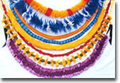 その後ひたすらカットし続けて、ある程度羽がたまった時点でレイ本体の作り方を教わります。芯となる4本取りの毛糸を用意し、その端にリポンをくくりつけます。そのすぐ下から羽を同色の綿糸で1本づつ巻き付けていきます。羽は爪で押して反りをつけ(私は爪が短くてうまく反りがつかず、見かねたポレットはスプーンを持ってきてくれた)、芯に押さえつけながら糸を3周巻き付け、輪にとおすようにしてでとめます。これを1枚1枚少しずつらせん状に位置をずらしながらやっていくのです。