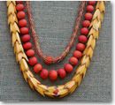 そして次なるお気に入りはこれ。Hala, kukuna-o-kala, Kikaneaを組み合わせたレイです。外側の黄色いレイはHalaという木の実を切って形をそろえてつなげたもの。外側の黄色い部分はハラという別名タコの木とも呼ばれる木で、実をきれいに切りそろえて使います。内側のKukuna-o-kalaはマングローブの一種。そして真ん中の赤くて丸いKikanea。これはなんとトマトの一種! でも食用ではないようです。テクニック的にはどうってことないんですが、こういうシンプルなものをアイデアで組み合わせたものは私の中では高得点。