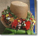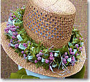 後は「ハク・レイ」を帽子の飾りとして使うハット・レイもかわいかったです。最初の写真の鮮やかな赤を取り入れたものもすごくきれいだったのですが、左のちょっと地味な色あいのレイに惹かれました。 Pink bozu(ピンクのボゾバナ=ボウズ花というらしい)をあしらって、Spanish moss, Pa`iniu,ハワイのシダ Palapalaiを使ったレイは、素朴な味わいで麦藁帽子にぴったり。