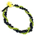 ハワイでは様々なシチュエーションで男性にも女性にもレイが贈られますが、女性にはカラフルでかわいい花のレイが贈られる一方、男性にはどちらかというとちょっとシックな(地味なというか..)レイが贈られることが多いような気がします。もちろん花のレイを男性にあげることもよくありますが、特別な機会には葉っぱだけのマイレのレイ、普段はシーグレープと呼ばれる小梅みたいな緑の実(ハワイ名はカイ・ワイナ)、ティーの葉のレイ、それにククイの実のレイなどがとてもポピュラーです。写真はシーグレープとククイナッツそれぞれのレイをツイストさせたもの。色合いがなかなかシブいです