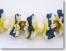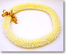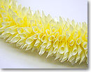 今月も引き続き、私が凝っているリボンレイをご紹介しましょう。今回はちょっと難易度アップのジンジャーのレイを作りました。難易度というよりも…どっちかというと「根気度」アップという感じ。どこまでも果てしなく切って切って、裂いて裂いて、つなげてつなげて、という単純作業が続きます。途中でくじそうになりながらも、なんとか2週間かかって仕上げれば、う〜ん人生苦もありゃ楽もある! 本物の花のレイのように見えるではないですか!! 後でご説明しますが、とっても面倒なリボンを裂いて作った花芯(かな?)の部分がいい感じにグラデーションになっていて、とっても素敵です。これは友人や同僚にもとっても好評でした。それでは作り方のご紹介です。